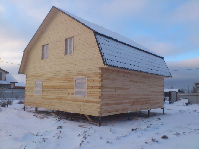 Каркас дома собирается из деревянных брусьев, обработанных антисептиками. Нижняя и верхняя обвязка соединяется между собой стойками, установленными с шагом 50-60 см. Балки перекрытия укладываются на стойки и закрепляются.
